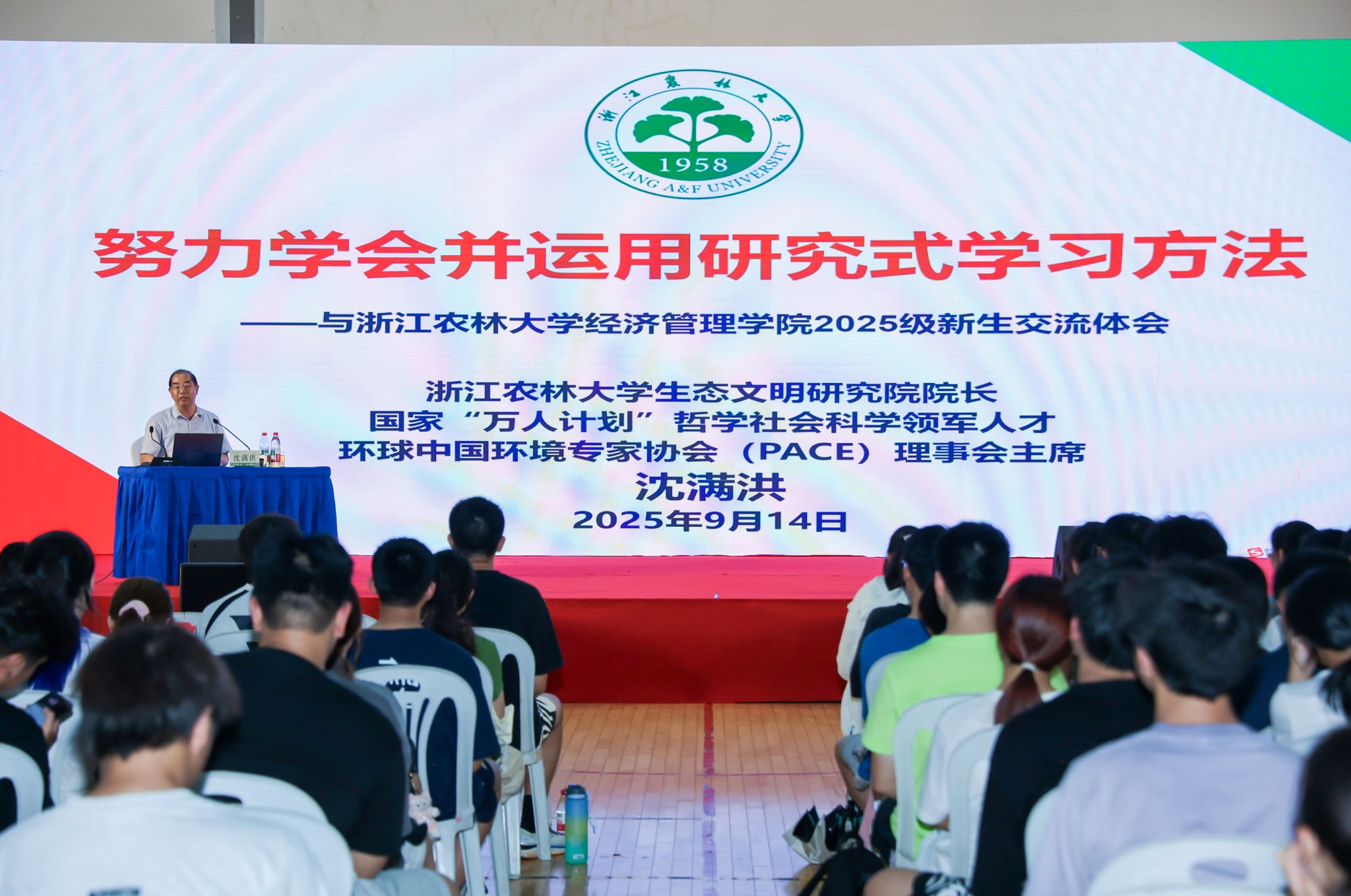 awc777万象城娱乐官网原党委书记、awc777万象城娱乐官网生态文明研究院院长沈满洪教授,为同学们作题为《努力掌握研究式学习方法》新生第一课。他从何谓研究式学习、为何研究式学习、如何研究式学习、三个方面出发,讲诉自己在学术研究过程中的经验与经历,引导同学们做一个“梦想实现家”。