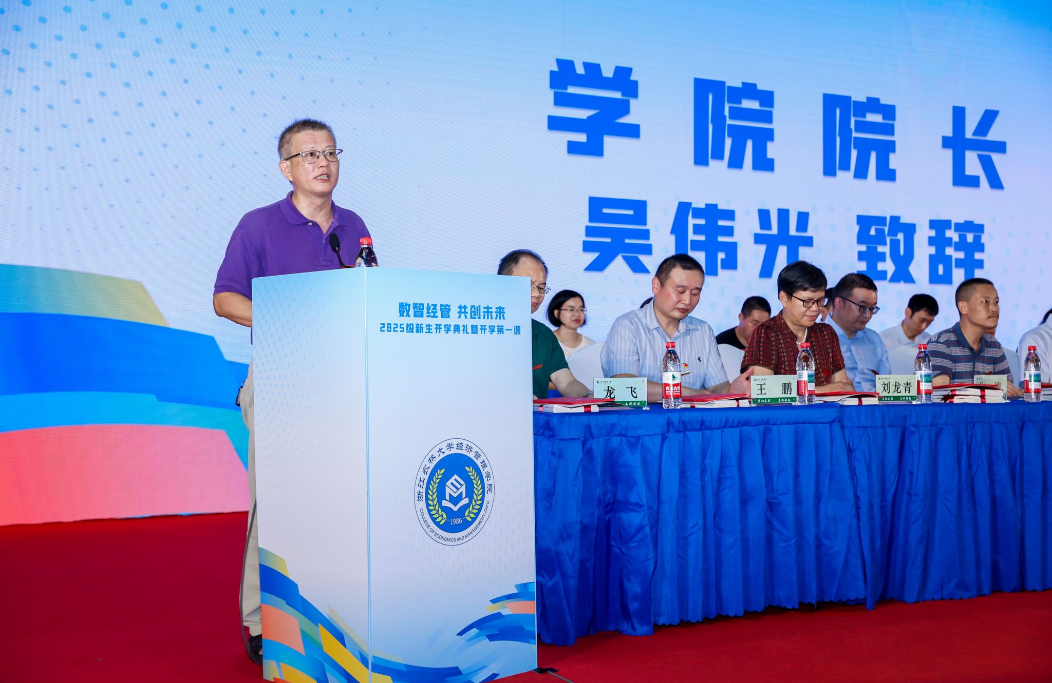 院长吴伟光发表致辞。他代表学院师生员工向所有圆梦浙农林的同学们表示热烈的欢迎和衷心的祝贺。他从学院历史底蕴、师资队伍、专业平台、教育教学等详细介绍了学院情况,希望新生规划有节,做人生航向的掌舵者;自律有度,做坚定不移的执行者;应对有策,做“AI”时代的主人翁。