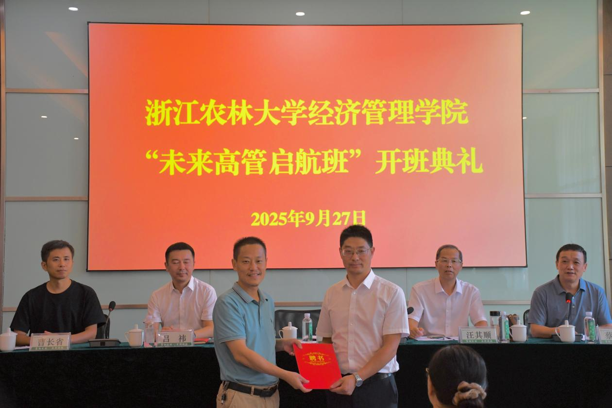 学院党委书记陈劲松在致辞中表示,“未来高管启航班”是学院响应国家产教融合战略的主动实践,其核心意义在于破解“学用脱节”难题,通过校企协同育人的创新模式,让学生深入企业,真实了解经济管理实践的第一现场,在具体的实践中深刻体会专业理论知识的应用价值。通过校企协同育人,让26名学员深入企业真实运营场景,实现“课堂学知识,实践悟真知”的教育目标;借助项目实践、案例研讨等形式,培养学员战略思维、资源整合、危机应对等核心能力,锻造“未来高管”基因;以“启航”为喻,承载为临安乃至浙江省培养高素质本土化高级经营管理人才的愿景,最终实现助力地方产业升级,服务区域发展的伟大使命。陈书记代表学院感谢以临安区经信局原局长汪其顺为代表的政府部门和中信银行临安支行吕祎副行长为代表的社会力量为启航班搭建的“校企协同、政校联动”平台,感谢傅贤军、罗娅娟、赵云飞等三位资深校外导师的大力支持,并现场为三位导师颁发聘书,正式确立导师团队与启航班的深度合作关系。