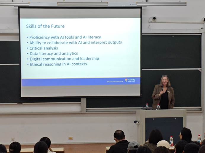 作为商业史专家,Lucy Newton教授为万象城官网同学作了《人工智能重塑商业:机遇与挑战》的专题报告。她以“人工智能如何重塑商业”为核心,向同学们介绍了 AI 在商科领域的应用现状,结合当前商科学生就业困惑,拆解当下热门商科岗位的真实工作场景,说明能力需求重塑的紧迫性,帮助学生清晰定位未来学习重点。