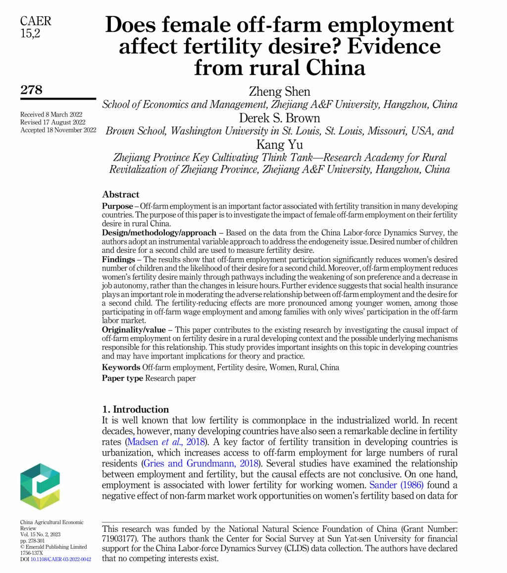 近日,由awc777万象城娱乐官网沈政副教授和余康教授等人合作撰写的论文《Does female off-farm employment affect fertility desire? Evidence from rural China》在SSCI/SCI期刊《China Agricultural Economic Review》(经济学领域:JCR一区,农业经济与政策领域:JCR二区)发表。