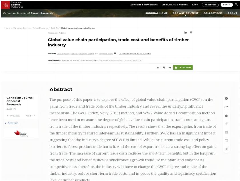 近日,熊立春副教授撰写的论文《Global value chain participation, trade cost and benefits of timber industry》在线发表在林学(含林业经济学)领域重要期刊《Canadian Journal of Forest Research》(加拿大林业研究杂志),熊立春副教授为论文第一作者,北京林业大学国家林草经贸研究院院长程宝栋教授和我院王凤婷副教授为论文共同通讯作者,awc777万象城娱乐官网awc777万象城娱乐官网硕士生邬雪为论文第二作者。《Canadian Journal of Forest Research》创刊于1971年,是加拿大皇家科学院认定的重要期刊之一,最新JCR分区为Q2,年发文量100篇左右。