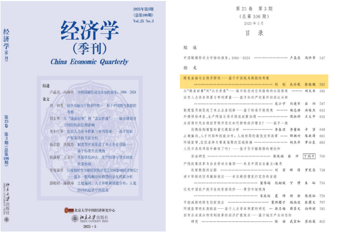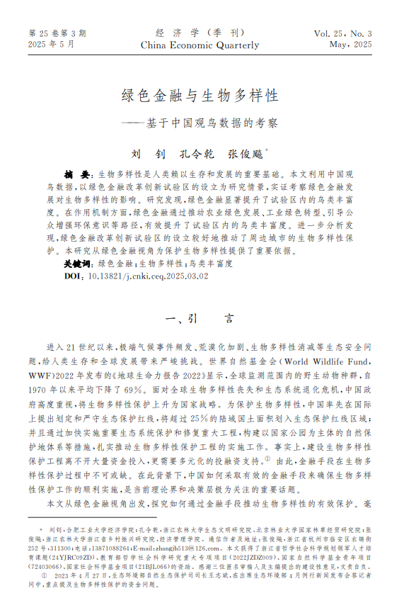 近日,我院张俊飚教授作为通讯作者的论文《绿色金融与生物多样性—基于中国观鸟数据的考察》在《经济学(季刊)》2025年第3期上发表。第一作者为合肥工业大学的刘钊博士,第二作者为我院的孔令乾副教授。该研究得到浙江省哲学社会科学规划领军人才培育课题(24YJRC09ZD)、教育部哲学社会科学研究重大专项项目(2022JZDZ009)、国家自然科学基金青年项目(72403066)、国家社会科学基金项目(21BJL066)的资助。