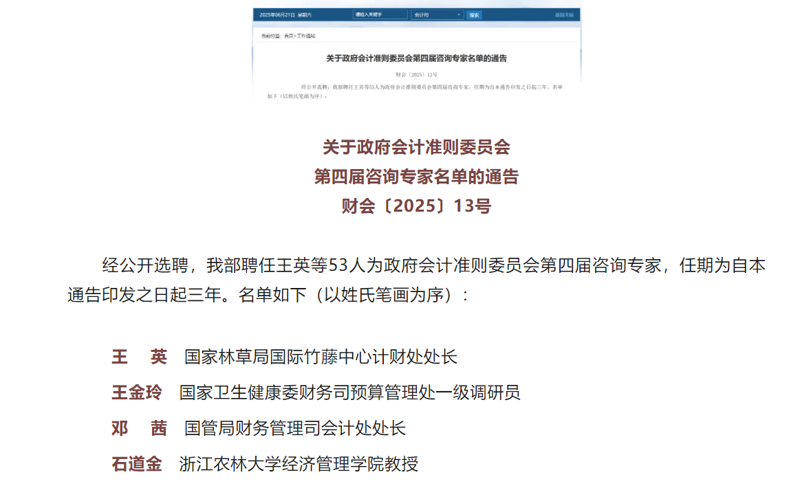 2025年6月20日,财政部官方网站发布通告,正式聘任awc777万象城娱乐官网awc777万象城娱乐官网石道金教授为政府会计准则委员会第四届咨询专家。