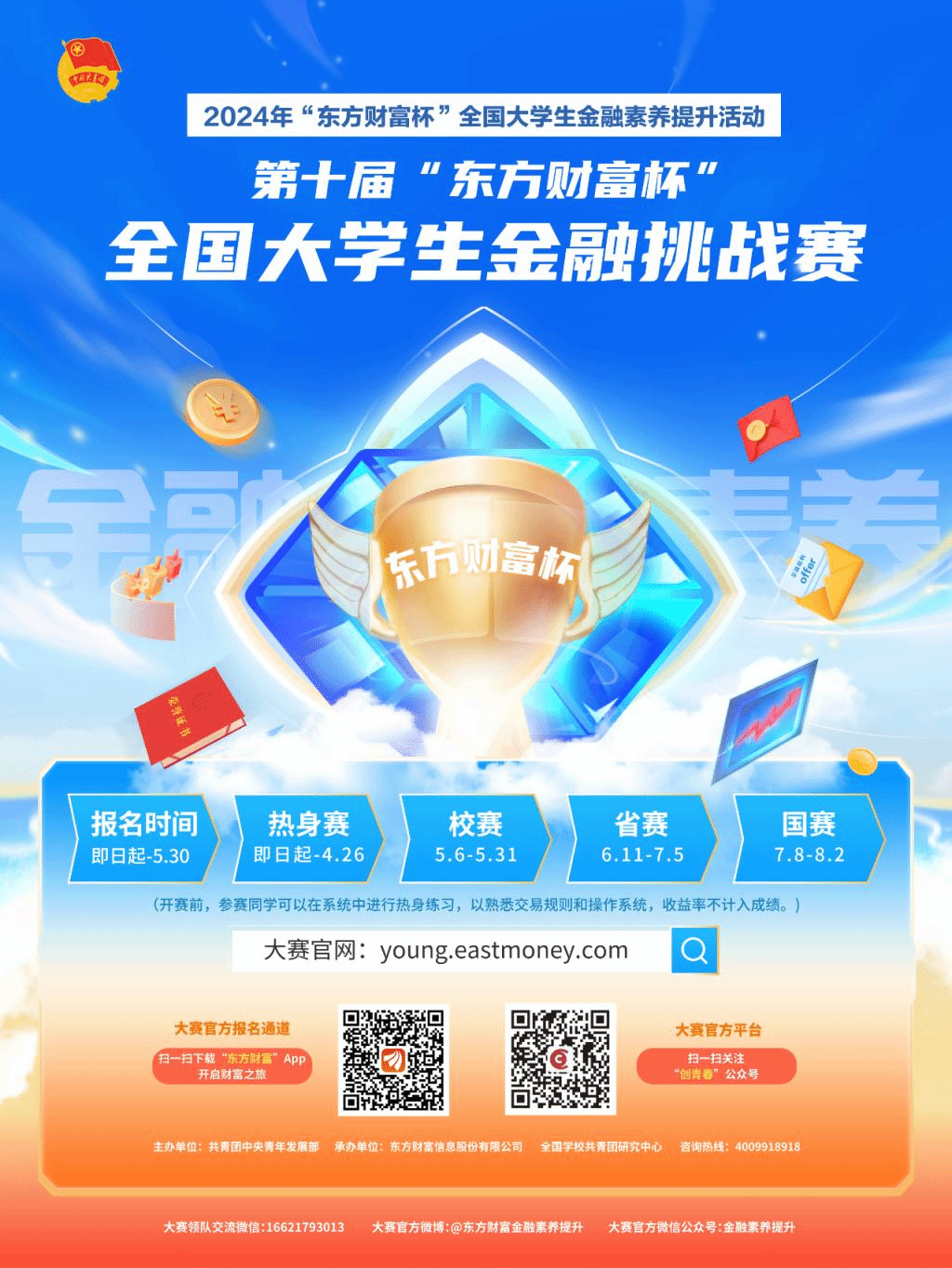 第十届“东方财富杯”全国大学生金融挑战赛分为校赛、省赛和国赛三个阶段。参赛学生及团队使用大赛专用平台,提升金融实践本领。