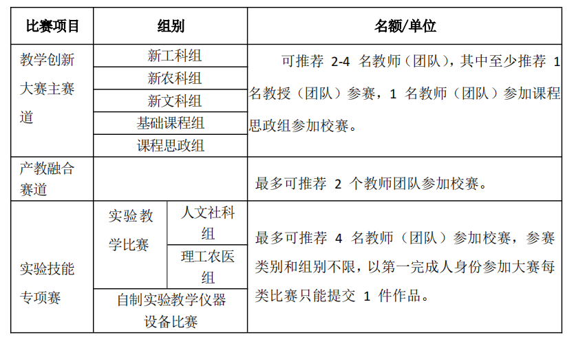 (一)教学创新大赛主赛道:紧扣建设高质量教育体系主题,深入推动高等教育教学改革,有效助力“四新”建设;充分发挥大赛的示范引领作用,全面推进课程思政建设,精心打造高校教师教学创新与交流的标杆。