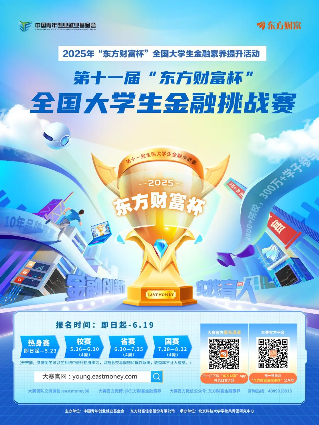 为深入学习宣传贯彻习近平新时代中国特色社会主义思想,贯彻落实党的二十大和二十届二中、三中全会精神、习近平总书记关于金融工作的重要指示和中央经济工作会议精神,组织动员广大高校青年学生学习金融知识、提升金融素养、提振发展信心、提高社会化能力,积极投身金融强国建设,共青团中央直属单位中国青年创业就业基金会和东方财富信息股份有限公司联合举办第十一届“东方财富杯”全国大学生金融挑战赛,作为“东方财富杯”全国大学生金融素养提升项目的重要内容。