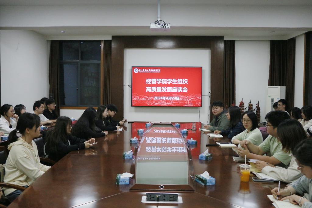 4月24日晚,万象城官网成功举办学生组织高质量发展座谈会。学院学生工作负责人胡云云主持会议,与院团委书记钟程凯、学生会秘书长蔡广越、辅导员及各部门负责人、优秀工作者共同探讨学生组织的挑战和未来发展。