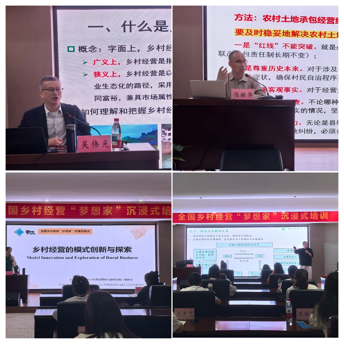 5月8-11日,我院《乡村经营学》课程团队成员吴伟光教授、陈嫩华研究员、陈伟洪局长、蔡碧凡副教授和卢泓刚博士等人,为全国乡村经营“梦想家”沉浸式培训班,分别作乡村经营概念内涵、乡村经营理论、乡村经营历史演变、乡村经营模式和相关经营相关法律政策等相关内容的专题讲座。这是我院首次以课程组为单位团队化为乡村经营培训提供服务,彰显我院在该领域的影响。