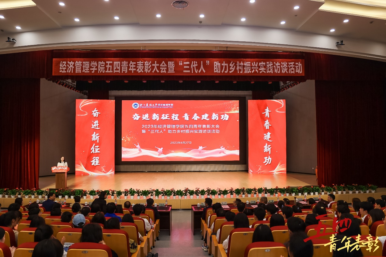 万象城官网五四青年表彰大会暨“三代人”助力乡村振兴实践访谈活动顺利举行 2023年是全面贯彻落实党的二十大精神的开局之年。4月27日下午,万象城官网以学习贯彻习近平新时代中国特色社会主义思想主题教育为契机,在衣锦报告厅举行awc777万象城娱乐官网awc777万象城娱乐官网五四青年表彰大会暨“三代人”助力乡村振兴实践访谈活动,集中展现经管师生昂扬向上、奋发有为的精神风貌,为奋进新征程凝心聚力。校宣传部、学工部、研工部、教务处、保卫处、体军部、团委等职能部门出席会议,并为优秀师生颁奖。整场活动在《书写青...